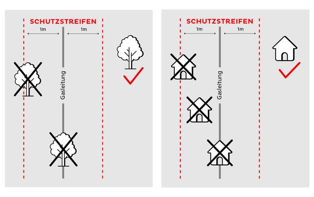 Im Schutzstreifen besteht grundsätzlich Bauverbot sowohl für Gebäude als auch Bauwerke. Ebenso dürfen keine Bepflanzungen im Schutzstreifen vorhanden sein.