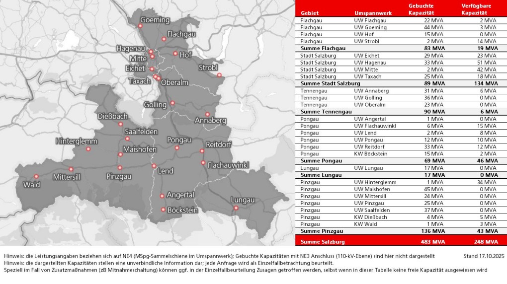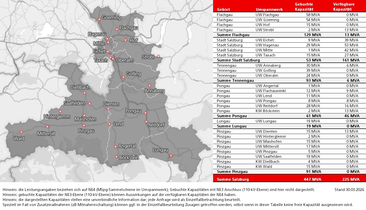 Gemäß ElWOG §20 veröffentlicht die Salzburg Netz GmbH für ihr Konzessionsgebiet die gebuchten und verfügbaren Einspeise-Kapazitäten je Umspannwerk (Netzebene 4). Die Berechnung der gebuchten und verfügbaren Kapazitäten wird entsprechend der Kapazitätsberechnungsmethoden-Verordnung 2022 durchgeführt. Die Daten werden quartalsweise aktualisiert und stellen jeweils den Stand zum angegebenen Datum dar. Anhand dieser Information besteht kein Rechtsanspruch auf eine Einspeisekapazität. Die Salzburg Netz GmbH stellt eine Anschlussbestätigung aus, sobald eine vollständige Anfrage zum Netzanschluss Erzeugungsanlage einlangt.